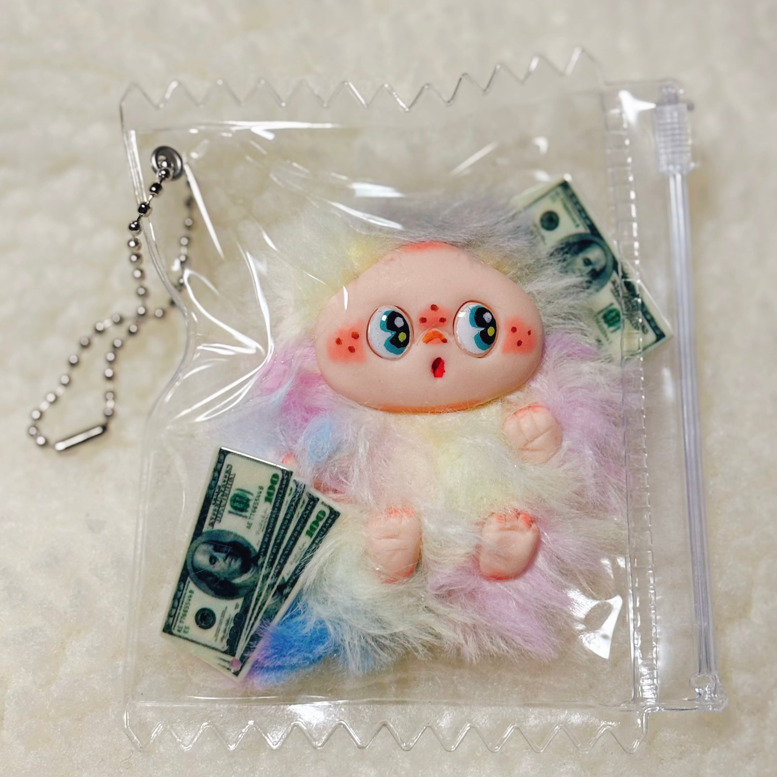 小さなドブブが入ったキャンディバッグのキーホルダーです。バッグは開け閉めできるので、ご自身の好きなものと入れ替えることもできます。